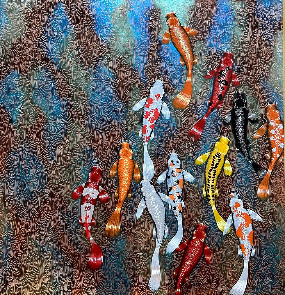 The artist’s use of brass and copper sheeting often matches the earthy tones of the wildlife he depicts, and the blues and greens of the patinas complements his depiction of aquatic life. Paul travels extensively across the globe to photograph wildlife both on land and under the water. As an avid diver, koi, jellyfish, and coral all appear as recurring themes in Paul’s work, offering interesting shapes and textures for his aquatic designs. Paul’s artworks are sized to suit a range of spaces, with his smallest works at just 25cm wide, and his largest works nearing a metre in width.